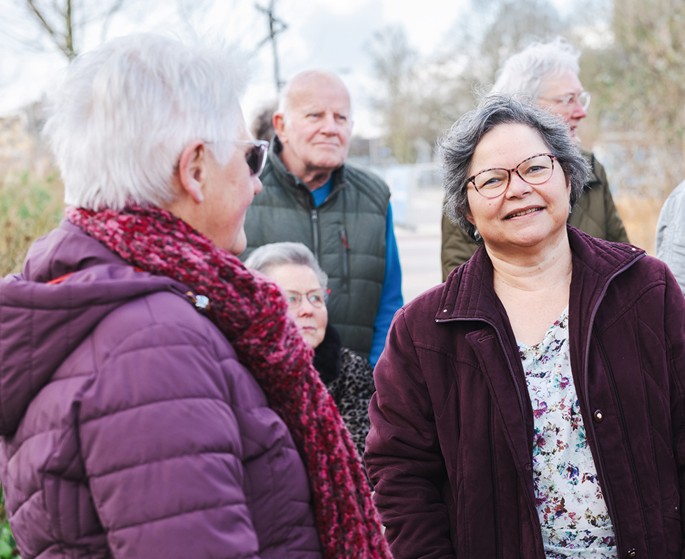 Waarom ik dit ben gaan doen? Vanwege mijn gezondheid moest ik stoppen met mijn baan als schoonheidsspecialiste. Maar niks doen is niets voor mij. Zo rolde ik in het vrijwilligerswerk, eerst op een peutergroep. Toen ik mantelzorger werd van mijn man bezocht ik vaak praatavonden bij Mozaïek Welzijn in Tiel. Al kletsend met andere mantelzorgers ontstond het idee: laten we naast praten ook eens iets ontspannends doen. Ik stelde voor om te gaan wandelen en richtte deze wandelgroep op. We startten met zes vrouwen en zijn nu met een groep van dertig enthousiaste wandelaars, mannen en vrouwen. Inmiddels ken ik iedereen heel goed. We hebben echt een band opgebouwd. Ik zag al heel wat vriendschappen ontstaan.